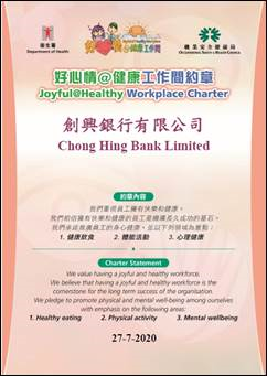 除荣获上述两项嘉许外,创兴银行亦签署了由卫生署、劳工处及职业安全健康局的“好心情@健康工作间”约章,承诺推广员工的身心健康。创兴银行将继续实施关爱员工的措施,与员工携手缔造愉快、健康及环保的工作间。